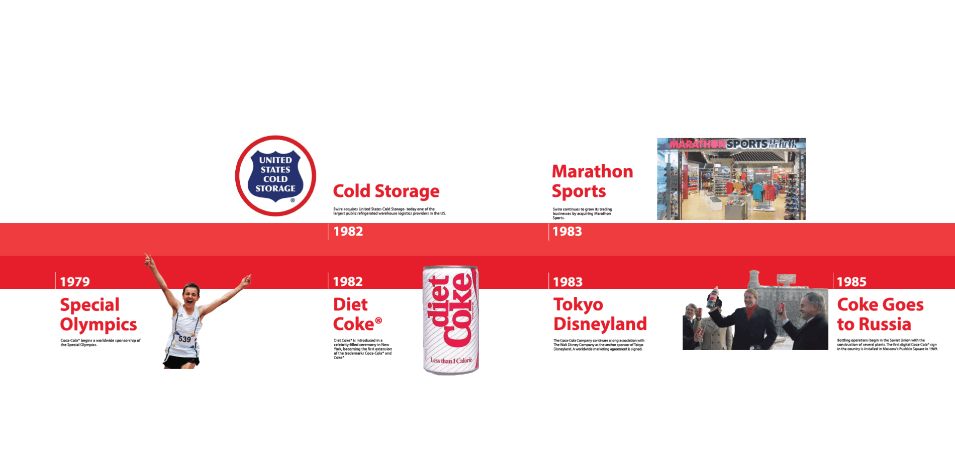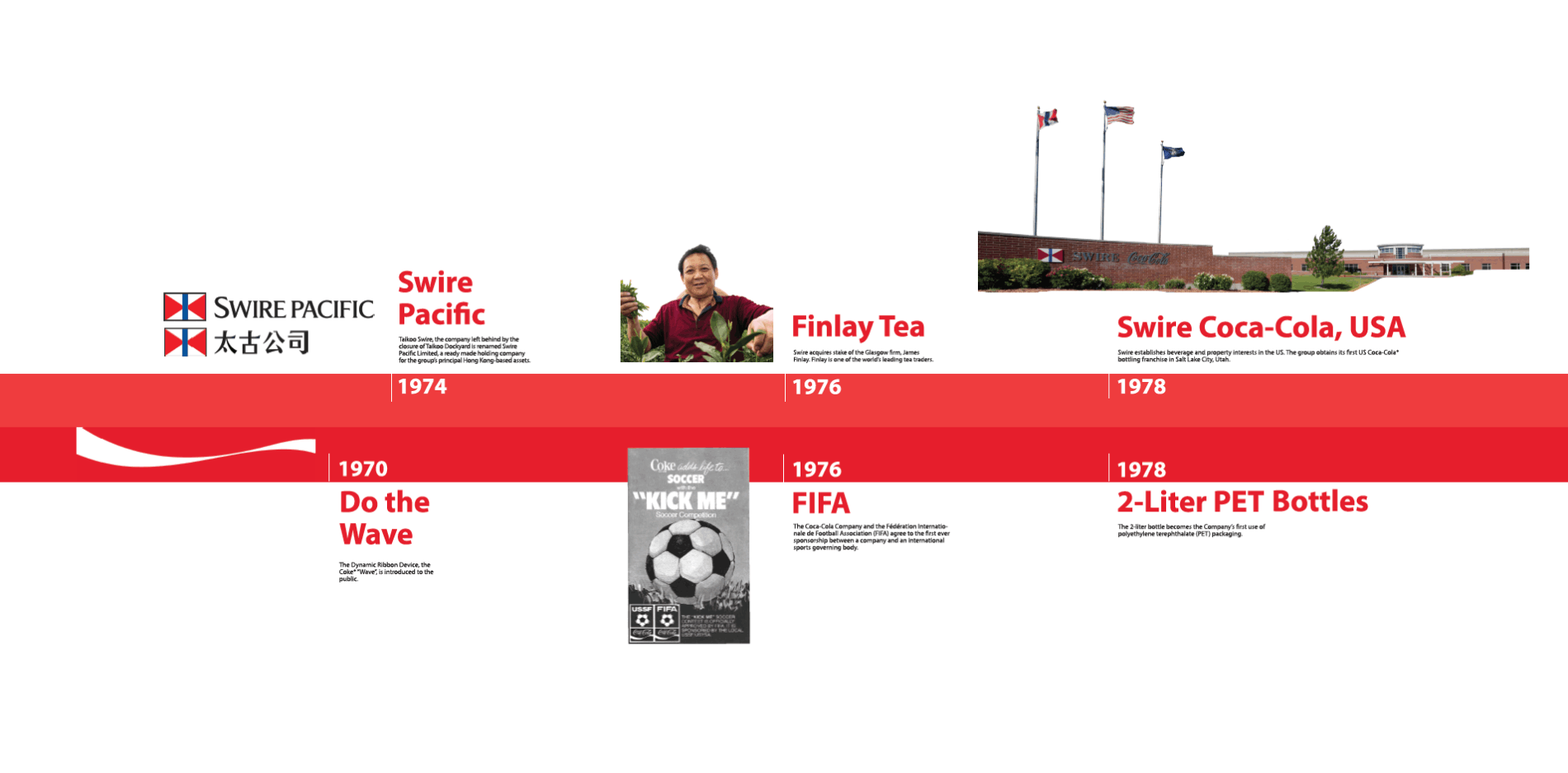 Swire Coca-Cola,USA is a bottler for Coca-Cola in the United States, with a territory covering 11 states. Their parent companies, Swire Pacific and Coca-Cola, both have rich histories. The task was to take two visually different timelines and combine them to create a cohesive story to display in their facilities.